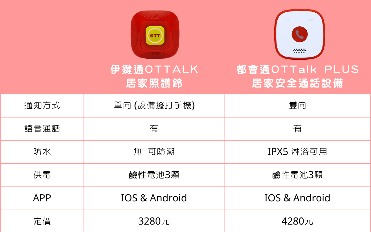 伊鍵通 OT Talk 科技照護鈴 (單向通話), 都會通 OT Talk PLUS 居家安全通話設備 (雙向通話)