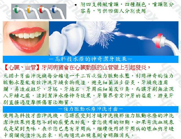 ○元諾士牙齒沖洗機每分鐘達一千二百次強力脈動水壓,利用神奇的強力脈動水壓能有效沖洗牙縫食物殘渣,避免細菌滋生發炎、牙縫殘渣腐爛,易造成蛀牙、牙垢、牙結石、牙周病細菌及口臭,而讓牙刷無法深入牙縫之處,達到潔淨水療神奇效果,牙醫界肯定沖牙的益處,避免牙刷直接過度摩擦傷害法瑯質。