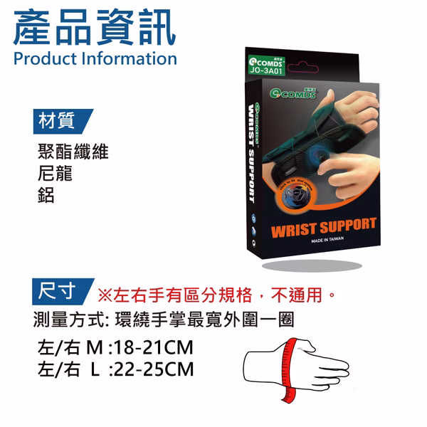 右手M 手掌最寬處18-21cm, 右手L 手掌最寬處22-25cm, 左手M 手掌最寬處18-21cm, 左手L 手掌最寬處22-25cm