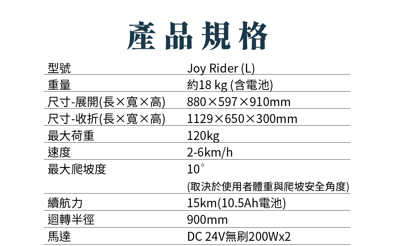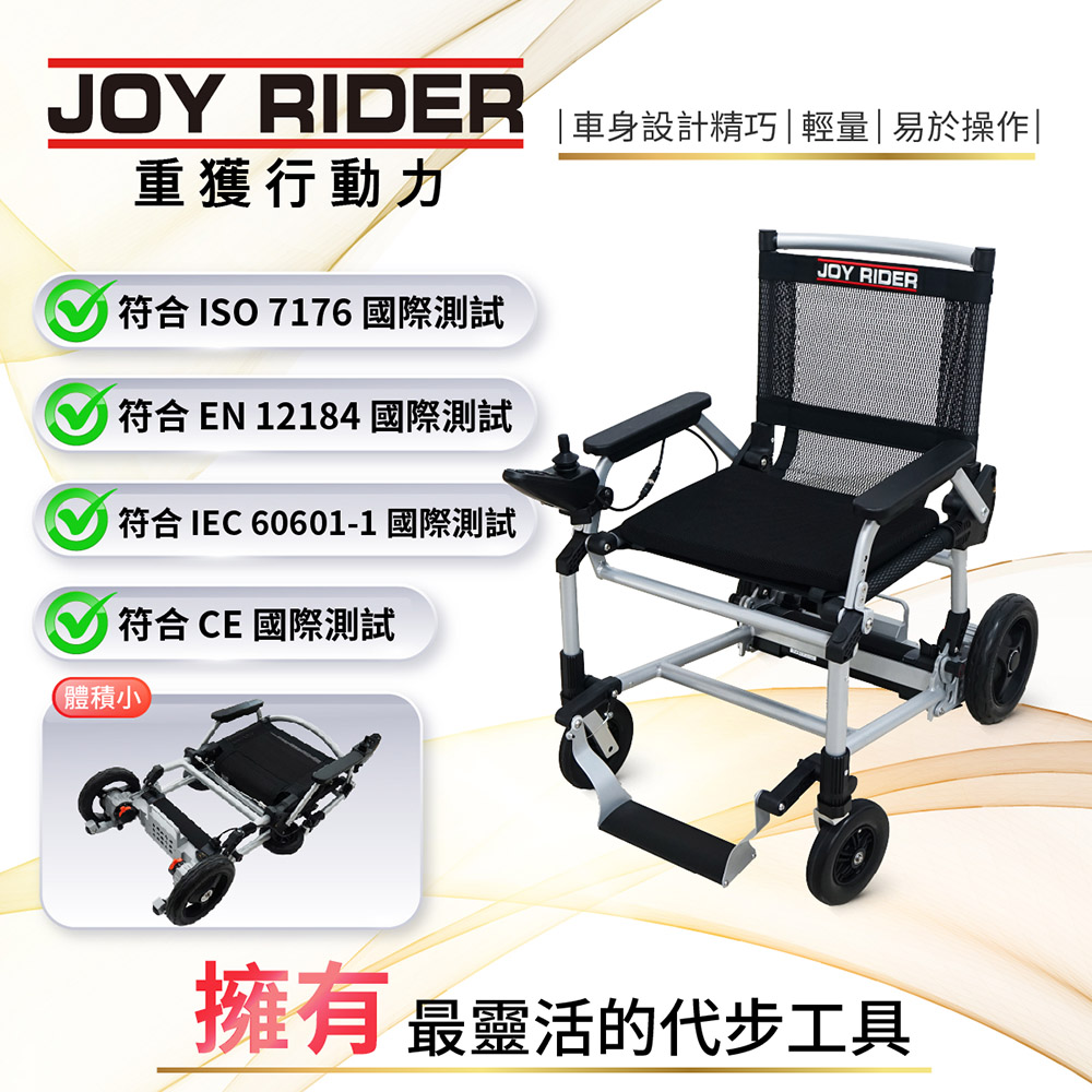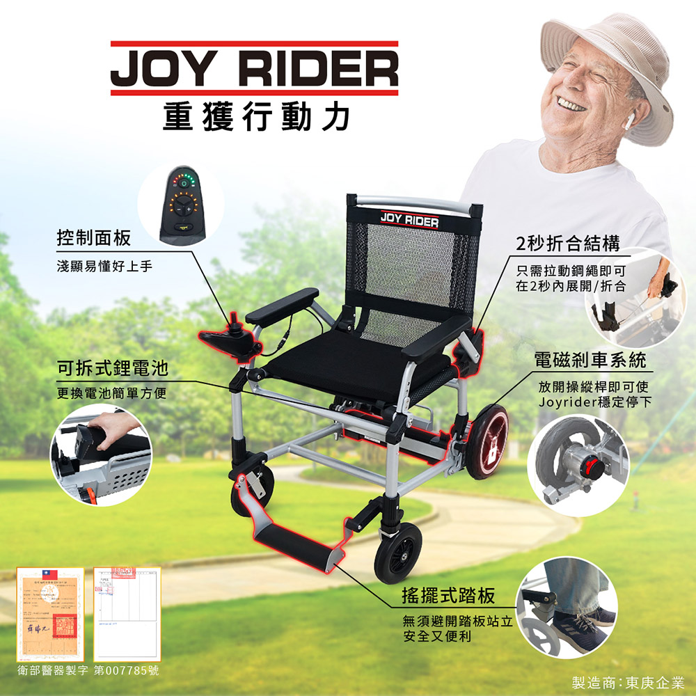 中文品名:“樂匠” 電動輪椅 英文品名:“Joy Rider”Powered Wheelchair 衛字核可字號:衛部醫器製字 第007785號 (到期日:116/12/24) 廣告許可字號:(靜態) 中市衛器廣字第11305038號 (到期日:116/05/28) (影片) 中市衛器廣字第11308064號 (到期日:116/08/02) (影片) 中市衛器廣字第11308066號 (到期日:116/08/07) 醫療器材商名稱:東庚企業股份有限公司 主製造廠:東庚企業股份有限公司 主製造廠址:臺中市潭子區潭富路二段160巷1號3樓 製造日期 : 詳見產品包裝標示 有效期間(或保存期限): 詳見產品包裝標示 消費者使用前應詳閱醫療器材說明書