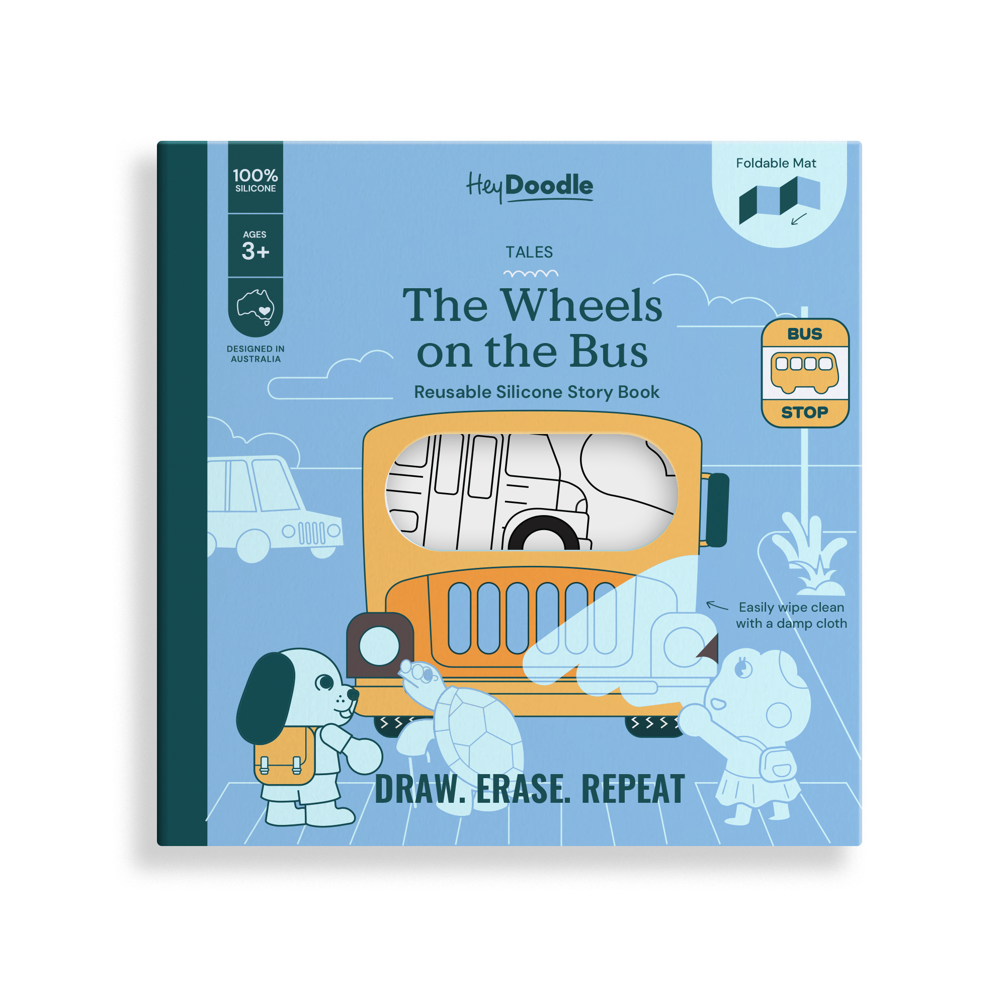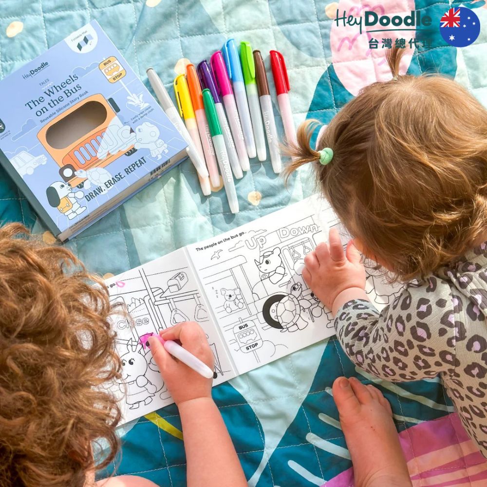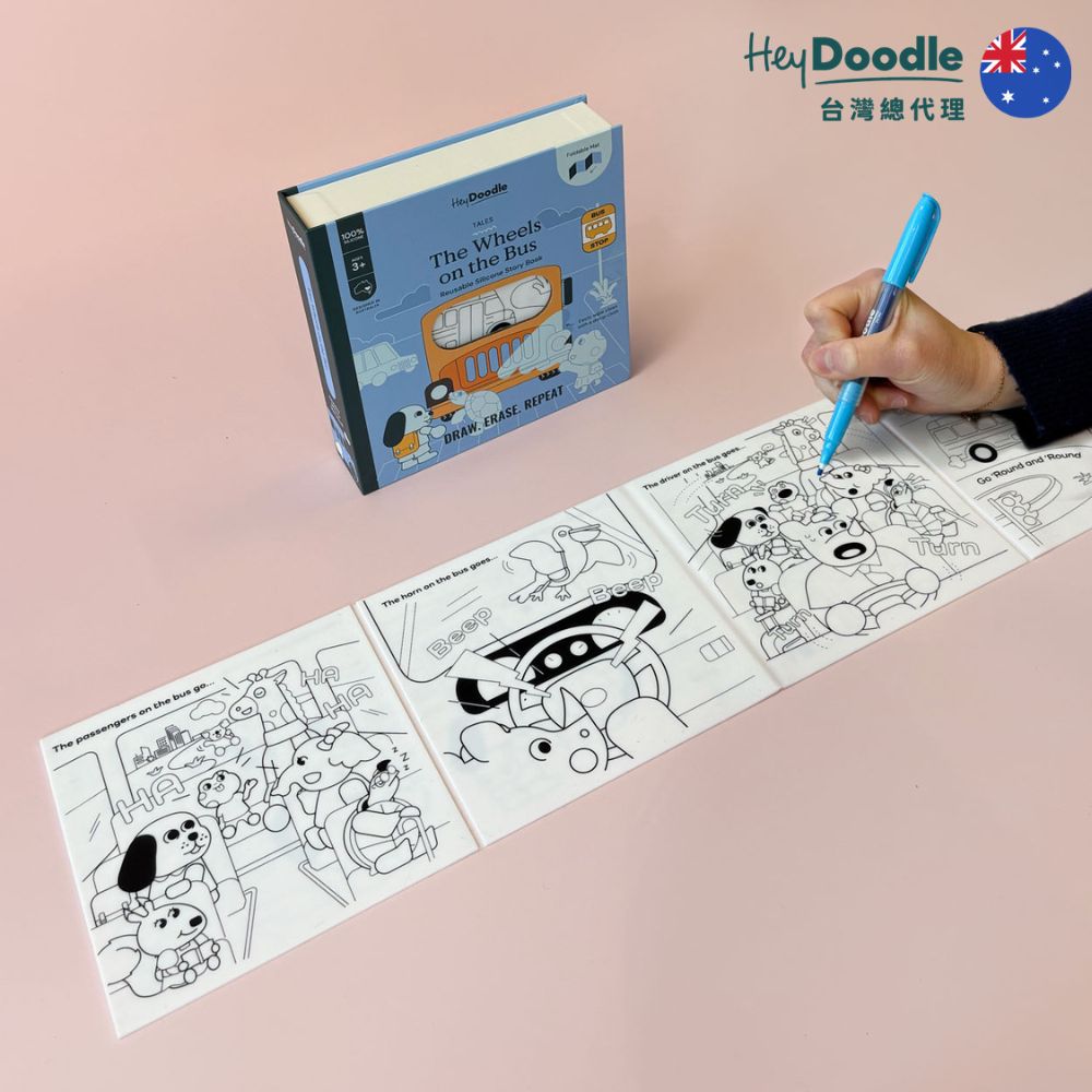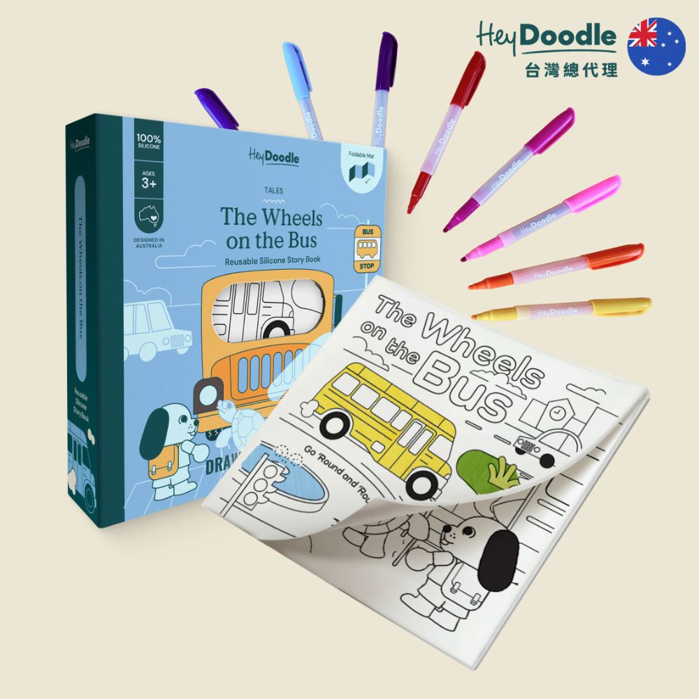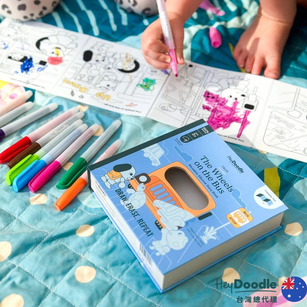HeyDoodle 將經典兒歌 「The Wheels on the Bus」 變成 互動塗鴉矽膠墊,孩子可以 描寫、塗色、探索每個場景,讓兒歌活靈活現、趣味滿分。從調皮的小猴子到愛睡的樹懶,可愛小動物們一一上車,陪孩子跟著歌詞故事冒險,在趣味中練習精細動作、早期識字與創意講故事。