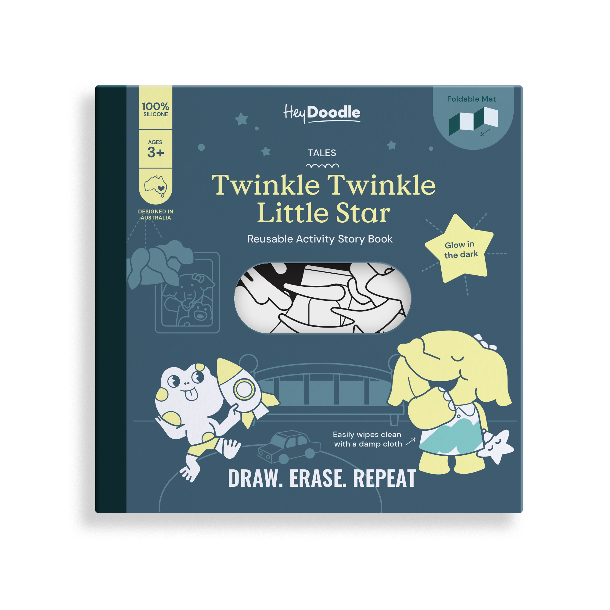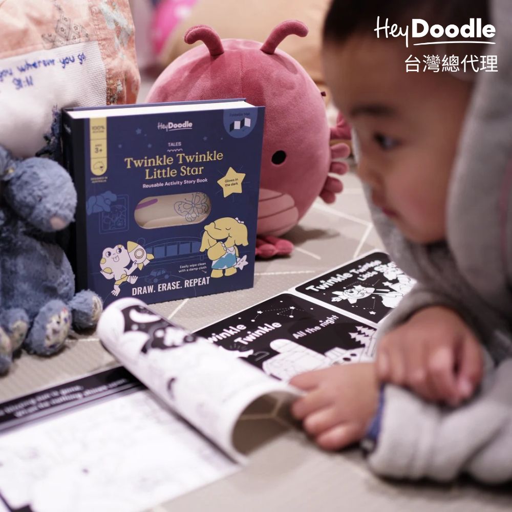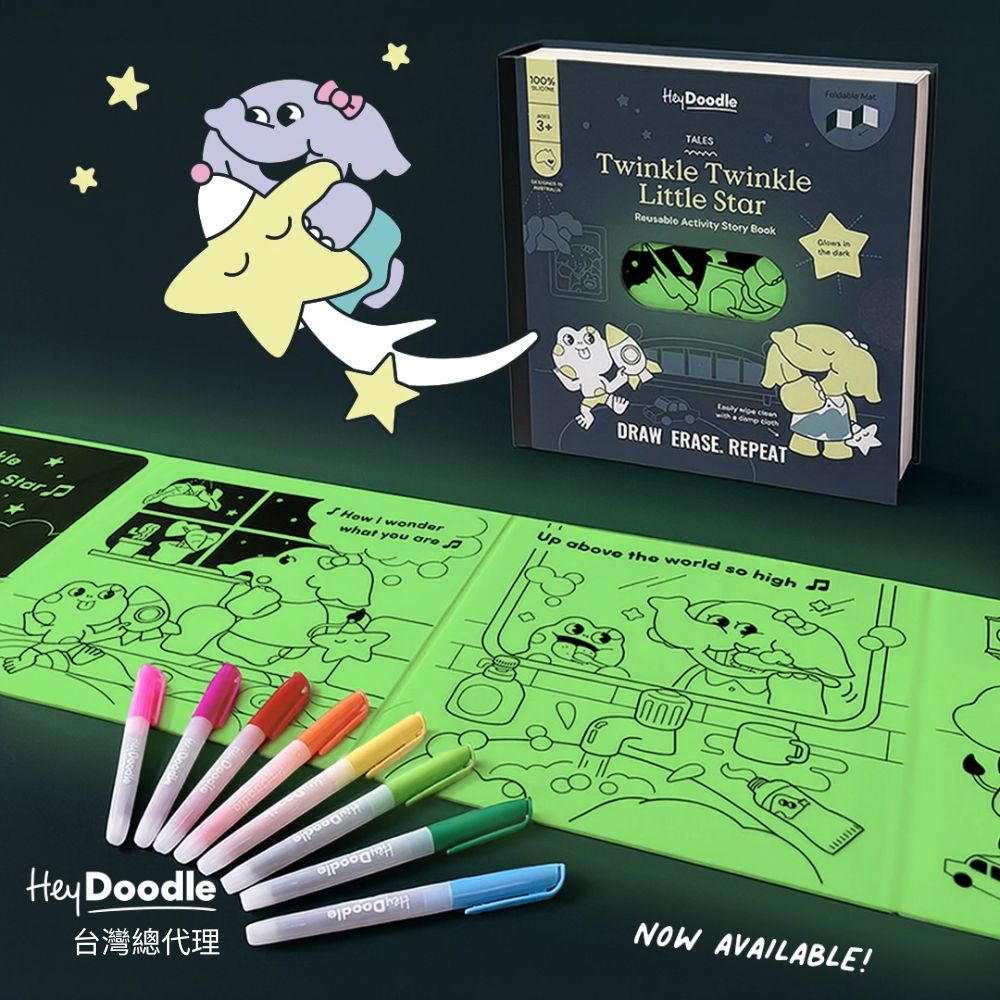 孩子的夜空冒險開始囉!HeyDoodle 將經典兒歌 《Twinkle Twinkle Little Star》 變成可重複擦寫的魔法矽膠畫墊,孩子可以 描寫歌詞、塗色星星與月亮,還有可愛的夜間小動物朋友 陪伴探索夜空。關燈後,畫墊上的星星、月亮等元素 會柔柔發光,讓睡前或安靜時光變成 舒緩又感官豐富的體驗。 這款畫墊同時幫助孩子認識簡單英文單字、發展精細動作與創意故事能力,將教育與奇幻完美結合。