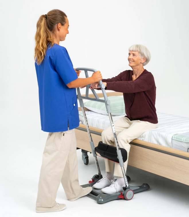 魔立站立式移位機/站立架 減輕搬抱負擔,移動到理想位置 魔立站立式移位機/站立架 (Molift Raiser) 活動手腳架的設計協助使用者從坐姿站立起來, 並且也提供在旁照顧的照護人員順利的協助處理這種狀況,幫助使用者順利移位。