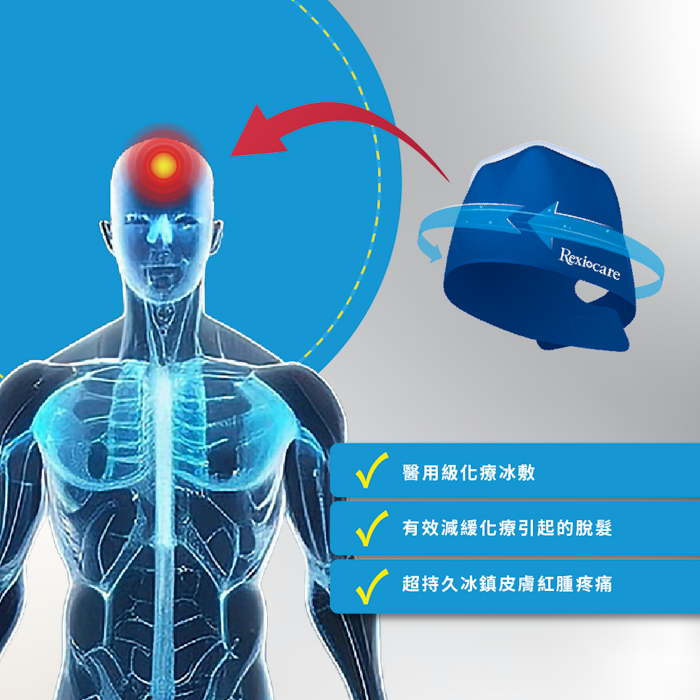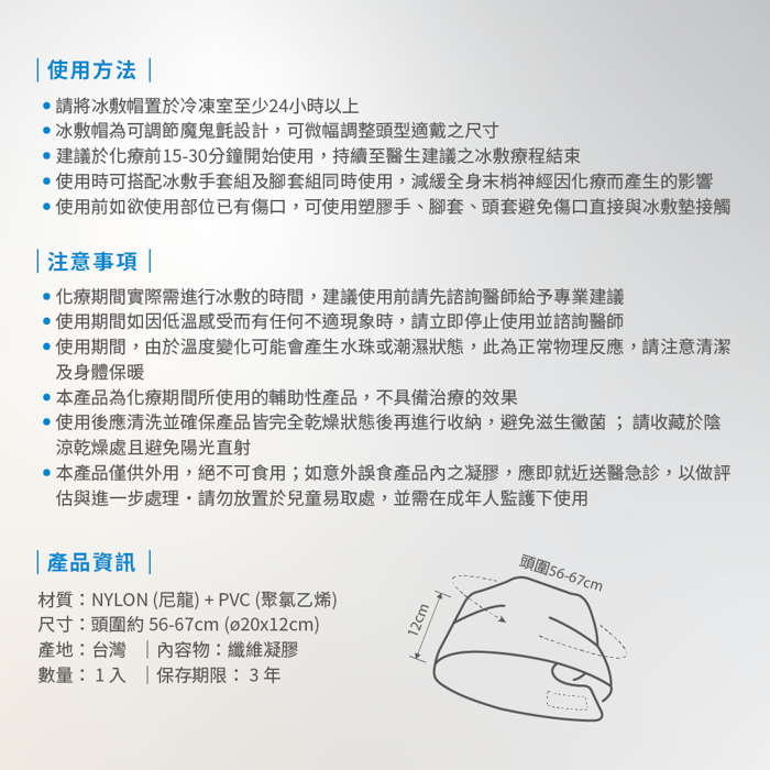 美國FDA研究,化療期間配戴冰敷帽(溫度3 °C),約有7成患者掉髮減少50%。 瑞斯冰敷帽可以幫助頭皮達到22°C的溫度,有效減緩化療引起的脫髮 通過低溫冷療技術能有效保護毛囊,減緩化療所導致的脫髮。 (備註:冰敷帽溫度會隨體溫和使用時間升高,建議準備多頂進行置換,幫助維持最佳溫度) 材質:NYLON(尼龍)+PVC(聚氯乙烯)|內容物:纖維凝膠 尺寸:頭圍約56-67cm(圓徑20x12cm)