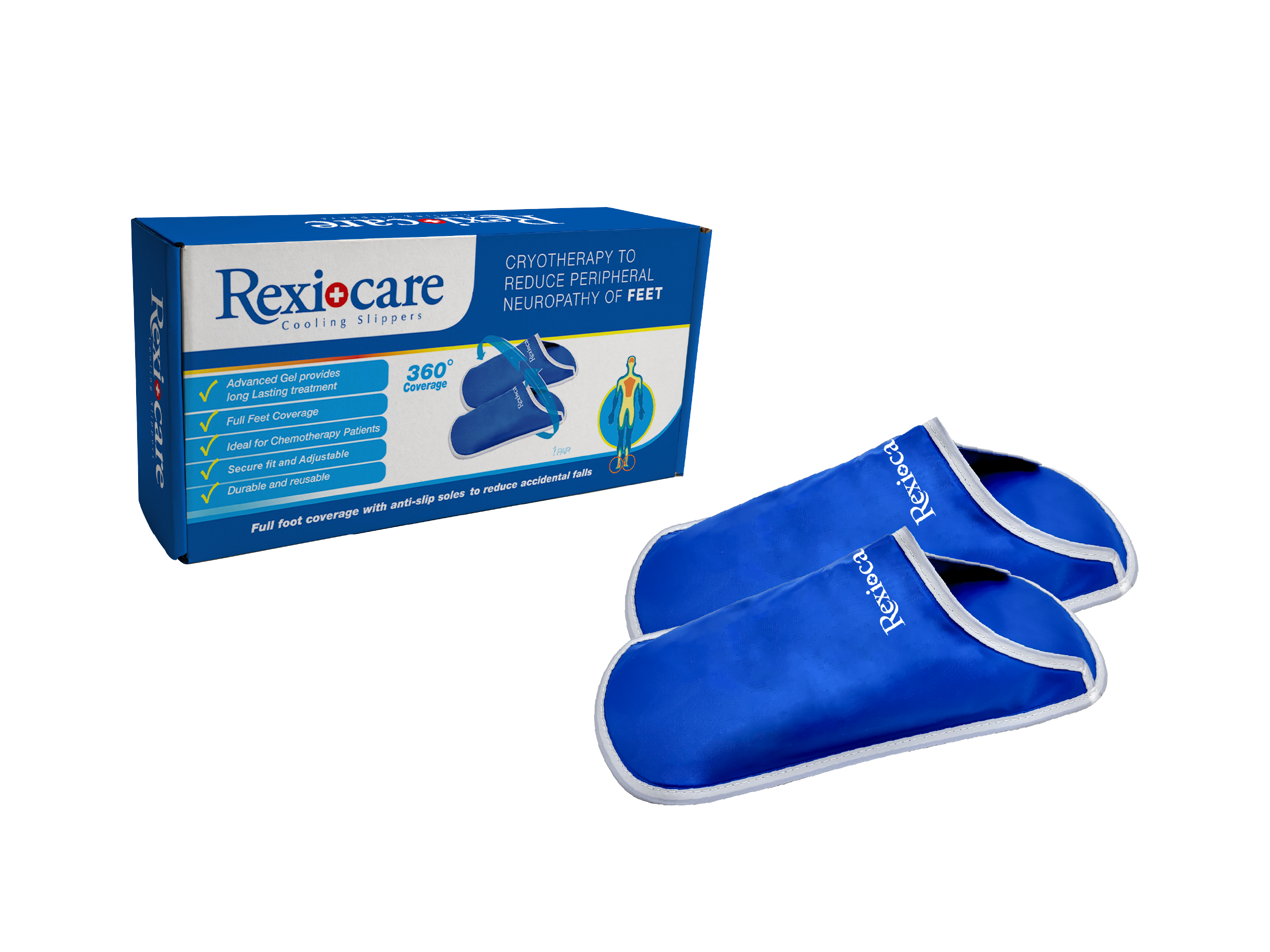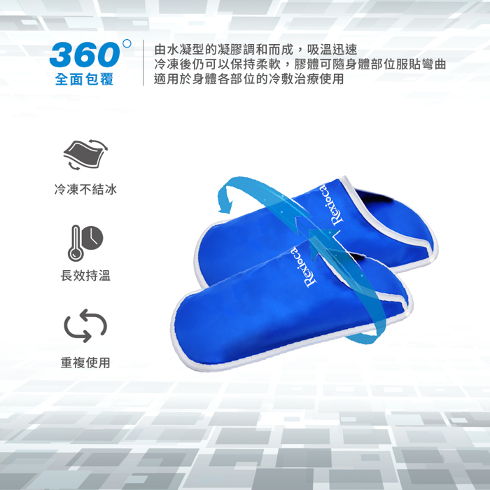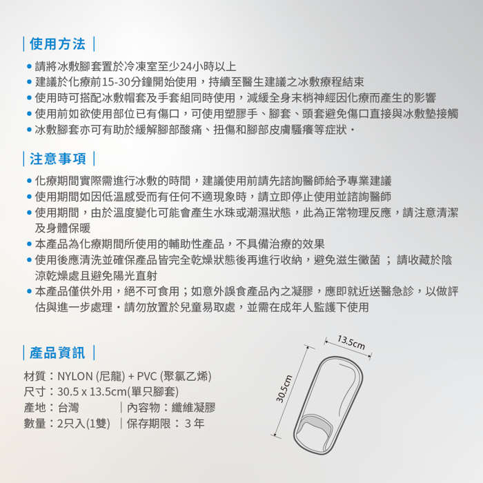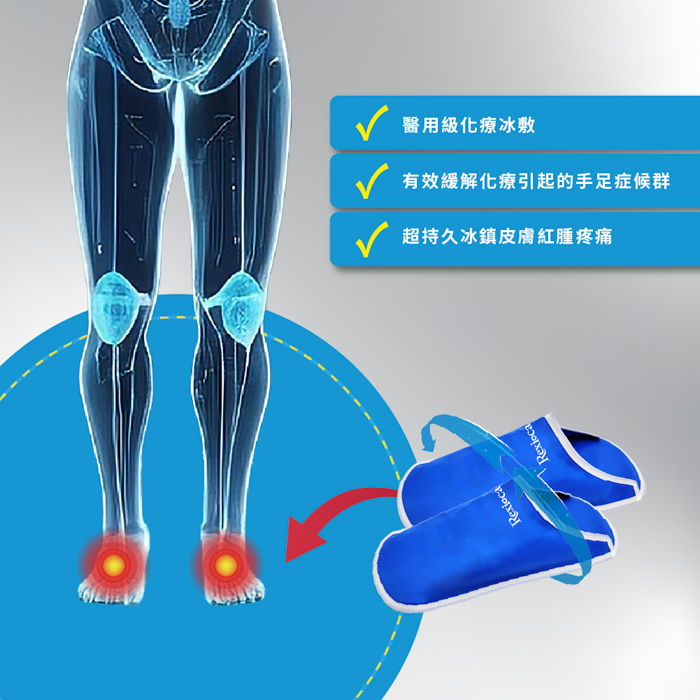 手足症候群症狀與掉髮可透過低溫冰敷方式, 經實驗室精心研發,瑞斯冰敷手套及拖鞋最低溫度可維持在−10至 −20°C區間 減少因溫度過低為患者帶來的不適感,且幫助減輕化療後手足症候群症狀 有效減輕化療引起的手部末梢神經損傷與不適感及掉髮等症狀。 適用於腳部使用,鞋套型設計便利配戴及包覆性佳。 材質:NYLON(尼龍)+PVC(聚氯乙烯)|內容物:纖維凝膠 尺寸:30.5 x 13.5cm (單只腳套)