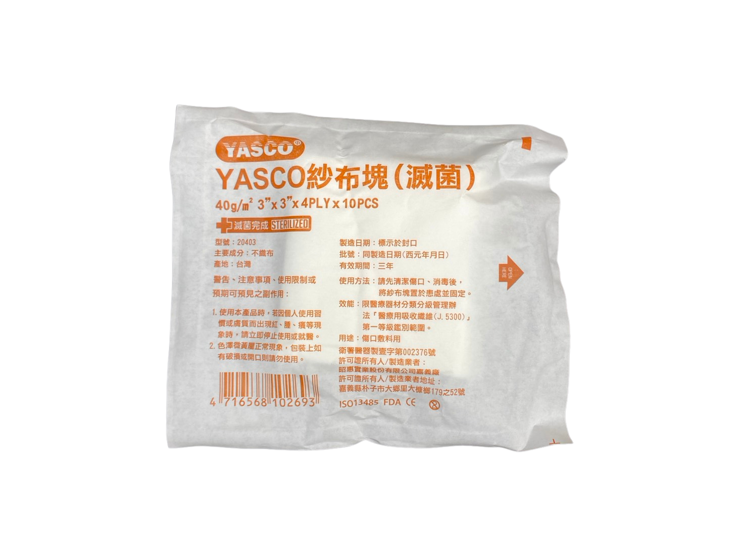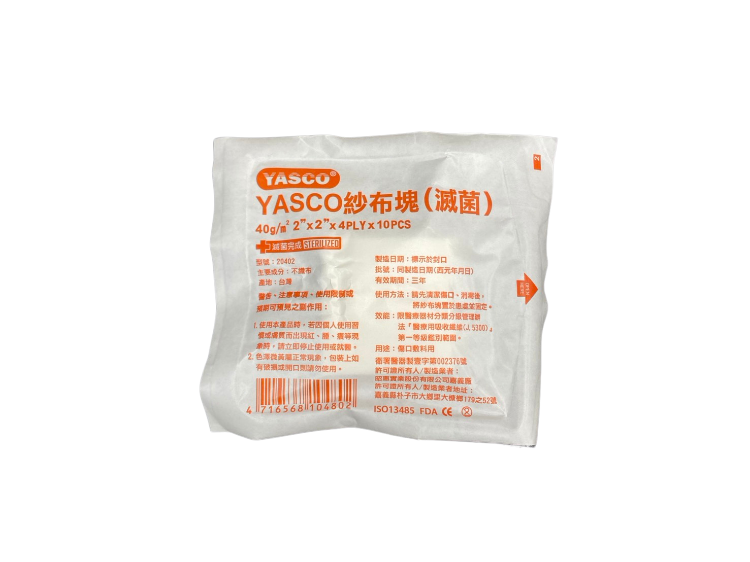 醫療器材許可證核准字號:衛署醫器製壹字第002376號 中文品名:YASCO 紗布塊 (滅菌) 藥商名稱:昭惠實業股份有限公司嘉義廠 藥商地址:嘉義縣朴子市大鄉里大槺榔179之52號 製造廠名稱:昭惠實業股份有限公司嘉義廠 製造廠地址:嘉義縣朴子市大鄉里大槺榔179之52號 產地:台灣