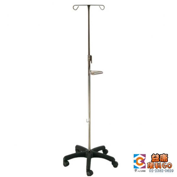 規格: – 高度可從165cm調高到250cm。 – 高度控制採用手壓式開關。 – 上架採用φ6分(19mm)x1.0mm不鏽鋼圓管。 – 下架採用φ1″(25mm)x1.0mm不鏽鋼圓管。 – 附手推把及尿袋掛勾。 – 五爪底座為塑鋼材質直徑長53cm。附五個2″活動塑膠輪。 – 所有尺寸±5%。